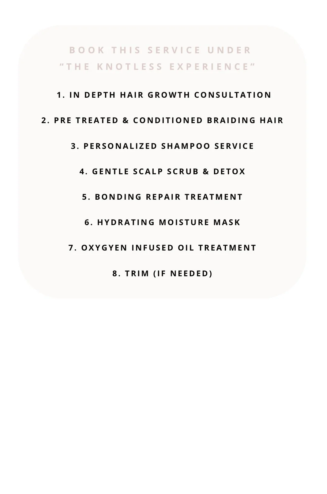 THE KNOTLESS EXPERIENCEhair Health | LENGTH retention | Client satisfaction Patience | Care | Reliability | Communication Patience | Care | Reliability | Communication Patience | Care | Reliability | Communication CLICK HERE TO BOOK AN APPOINTMENT